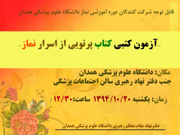 به گزارش خبرنگار صدای دانشجو،به همت دفتر نهاد رهبری دانشگاه علوم پزشکی همدان آزمون کتبی کتاب پرتوی از اسرار نماز در سالن اجتماعات این دانشگاه بر گزار می گردد.