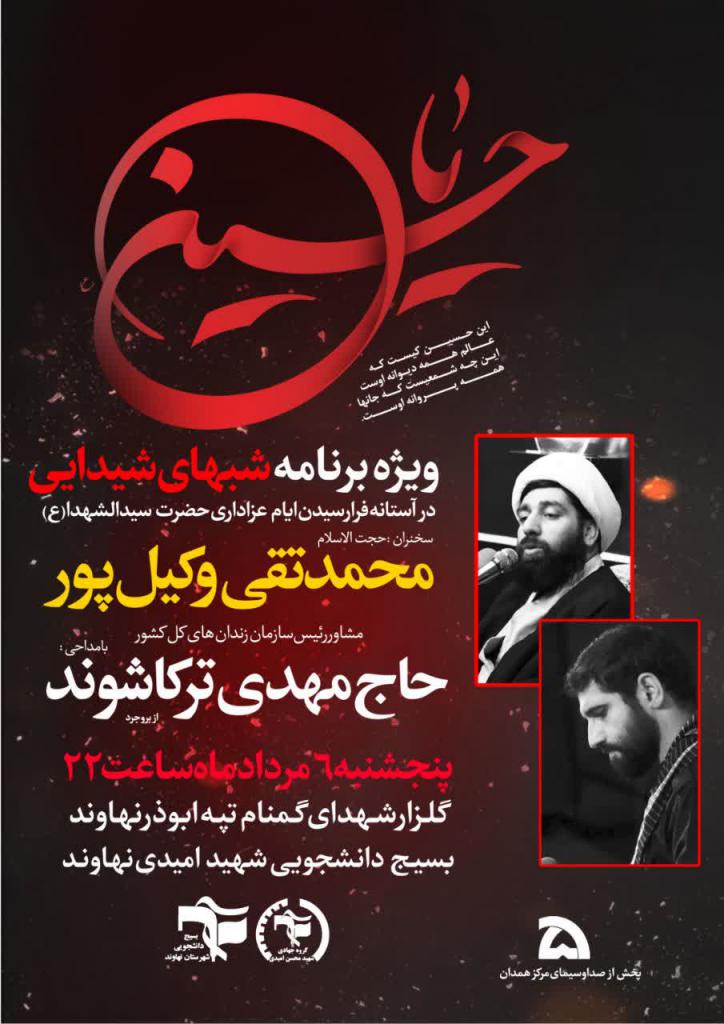 به گزارش پایگاه خبری تحلیلی صدای دانشجو، به همت بسیج دانشجویی شهید امیدی شهرستان نهاوند، پنج شنبه ۶ مرداد ماه راس ساعت ۲۲:۰۰ ویژه برنامه شب های شیدایی در جوار مقبره شهدای گمنام تپه ابوذر، برگزار خواهد شد.