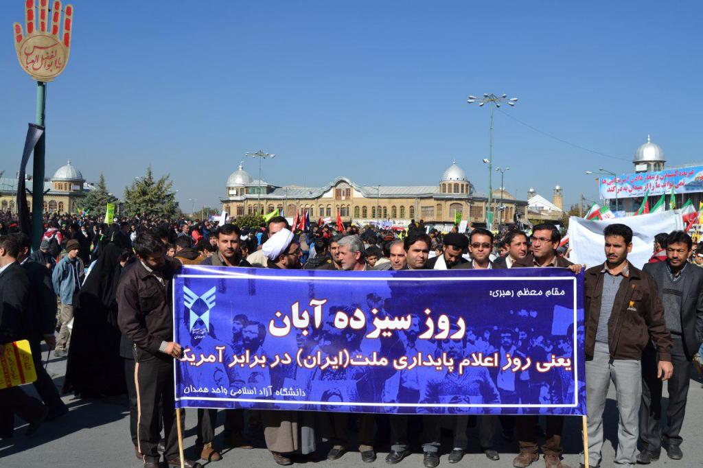به گزارش صدای دانشجو، راهپیمایی یوم الله 13 آبان  با حضور دانشجویان، کارکنان، اساتید و اعضای هیات علمی دانشگاه آزاد اسلامی واحد همدان و اقشار مختلف مردم با طنین شعار «مرگ بر آمریکا» و «مرگ بر اسرائیل» برگزار شد.
